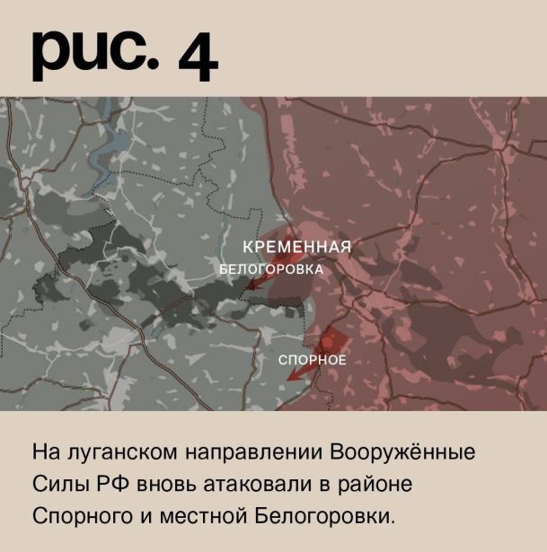 На луганском направлении Вооружённые Силы РФ вновь атаковали в районе Спорного и местной Белогоровки. (Рис. 4)