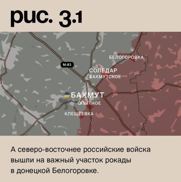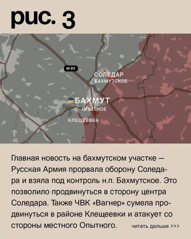 Главная новость на бахмутском участке - Русская Армия прорвала оборону Соледара и взяла под контроль н.п. Бахмутское. Это позволило продвинуться в сторону центра Соледара. Также ЧВК «Вагнер» сумела продвинуться в районе Клещеевки и атакует со стороны местного Опытного. А северо-восточнее российские войска вышли на важный участок рокады в донецкой Белогоровке. (Рис. 3)
