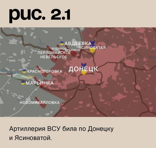 На донецком фронте российские войска на земле вновь сосредоточили основные усилия в направлении Новомихайловки, Невельского и Первомайского. В городской черте Марьинке встречные бои. Также Вооружённые Силы РФ атакуют со стороны Водяного и Опытного. Артиллерия ВСУ била по Донецку и Ясиноватой. (Рис. 2)