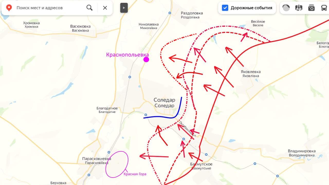 Вчера вечером наши войска в районе Соледара смогли взять под контроль несколько опорных пунктов ВСУ севернее Соледара и вышли к н.п. Краснополевка - сообщает военкор Юрий Котенок.