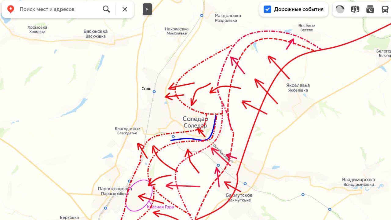 Разбитые части из города выводят, но взамен новых не шлют, а это говорит о том, что на Соледаре военное командование Украины уже поставило крест. Между тем, наши войска, не давая противнику передышки, продолжают штурм в центре, и особо настойчиво атакуют по направлению к н.п. Благодатное и ж.д. станции Соль, чтобы тем самым замкнуть кольцо окружение вокруг засевшего в западной и центральной части города врага. Источник