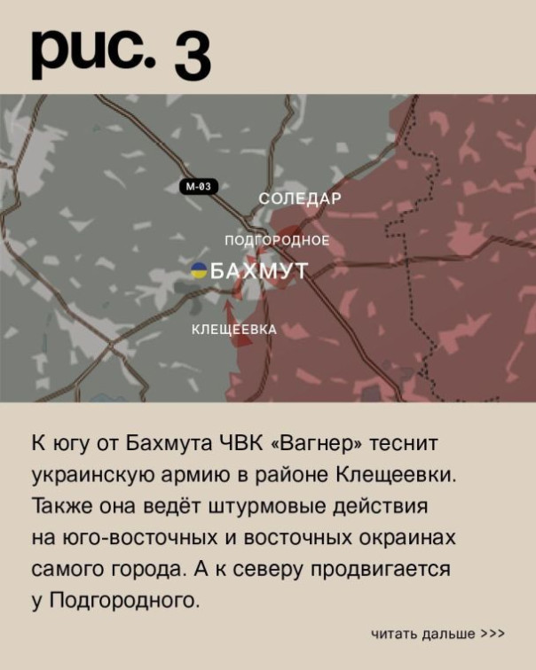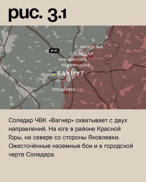К югу от Бахмута ЧВК «Вагнер» теснит украинскую армию в районе Клещеевки. Также она ведёт штурмовые действия на юго-восточных и восточных окраинах самого города. А к северу продвигается у Подгородного. Соледар ЧВК «Вагнер» охватывает с двух направлений. На юге в районе Красной Горы, на севере со стороны Яковлевки. Ожесточённые наземные бои и в городской черте Соледара. (Рис. 3)