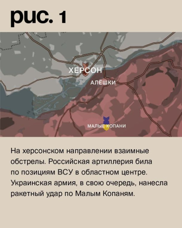 На херсонском направлении взаимные обстрелы. Российская артиллерия била по позициям ВСУ в областном центре. Украинская армия, в свою очередь, нанесла ракетный удар по Малым Копаням. (Рис. 1)