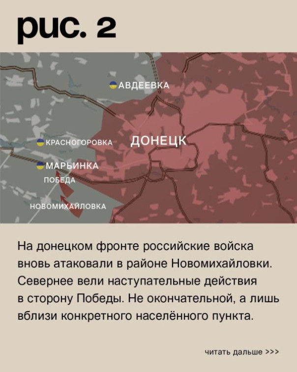 На донецком фронте российские войска вновь атаковали в районе Новомихайловки. Севернее вели наступательные действия в сторону Победы. Не окончательной, а лишь вблизи конкретного населённого пункта. Также российские войска возобновили штурмовые действия в городской черте Марьинки. ВСУ держат оборону. Кроме того, Вооружённые Силы РФ вновь предприняли атаку украинского укрепрайона в Красногоровке. Севернее в очередной раз пытались продвинуться у Первомайского и Водяного. (Рис. 2)