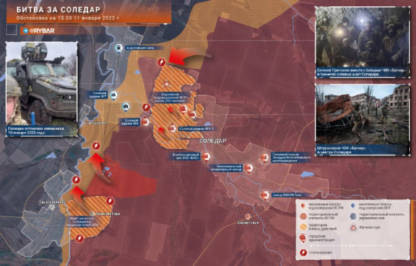 10 января был фактически окружён соледарский гарнизон ВСУ с запада, юга и севера, что лишило их возможности снабжения. Сегодня ночью некоторые отряды ВСУ частично смогли сбежать из населённого пункта.