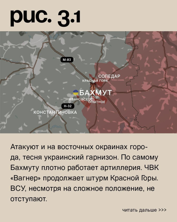По мнению авторов канала, одновременное продвижение штурмовых отрядов ЧВК «Вагнер» от Соледара, 144 мотострелковой дивизии ВС РФ на Лиманском участке и освобождение Белогоровки создает предпосылки к выходу к Северску и его оперативному окружению с юга, севера и востока.