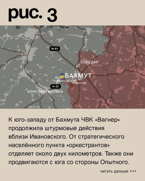 К юго-западу от Бахмута ЧВК «Вагнер» продолжила штурмовые действия вблизи Ивановского. От стратегического населённого пункта «оркестрантов» отделяет около двух километров. Также они продвигаются с юга со стороны Опытного. Атакуют и на восточных окраинах города, тесня украинский гарнизон. По самому Бахмуту плотно работает артиллерия. ЧВК «Вагнер» продолжает штурм Красной Горы. ВСУ, несмотря на сложное положение, не отступают. А вот к северу от Соледара «музыканты» установили контроль над Николаевкой. И наступают вдоль автомобильной трассы и железнодорожной ветки на Роздоловку и Переездное, приближаясь с юга к Северску. К востоку от этого города Вооружённые Силы РФ вновь попытались прорваться в районе Спорного. (Рис. 3)
