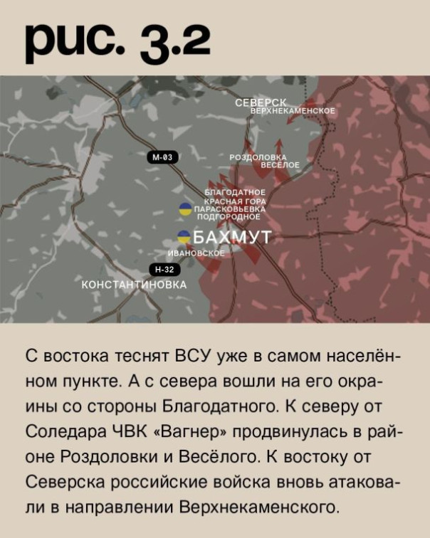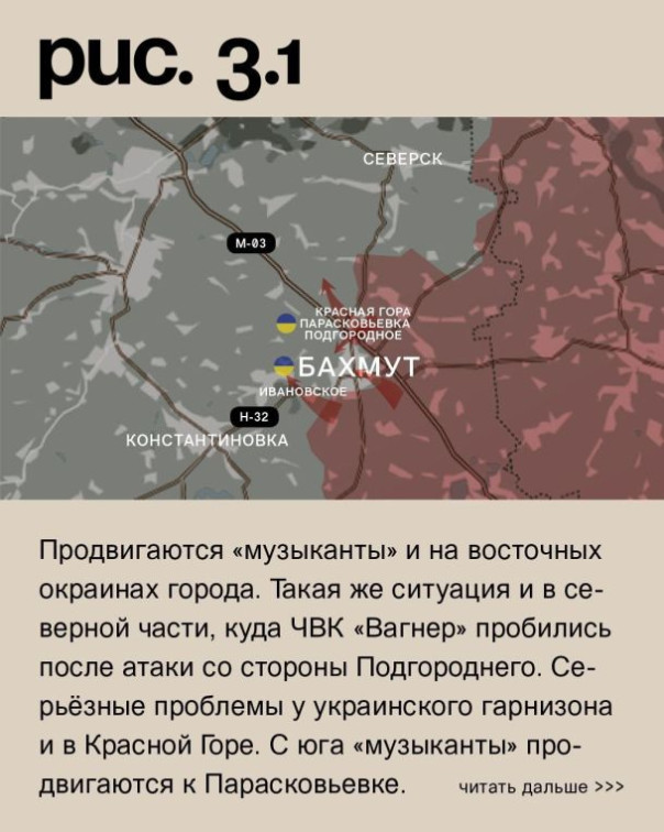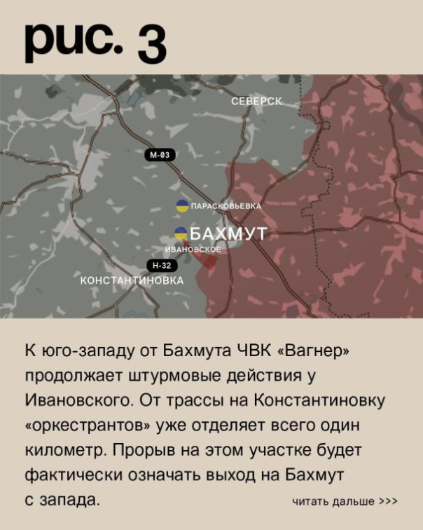 К юго-западу от Бахмута ЧВК «Вагнер» продолжает штурмовые действия у Ивановского. От трассы на Константиновку «оркестрантов» уже отделяет всего один километр. Прорыв на этом участке будет фактически означать выход на Бахмут с запада. Продвигаются «музыканты» и на восточных окраинах города. Такая же ситуация и в северной части, куда ЧВК «Вагнер» пробились после атаки со стороны Подгороднего. Серьёзные проблемы у украинского гарнизона и в Красной Горе. С юга «музыканты» продвигаются к Парасковьевке. С востока теснят ВСУ уже в самом населённом пункте. А с севера вошли на его окраины со стороны Благодатного. К северу от Соледара ЧВК «Вагнер» продвинулась в районе Роздоловки и Весёлого. К востоку от Северска российские войска вновь атаковали в направлении Верхнекаменского. (Рис. 3)
