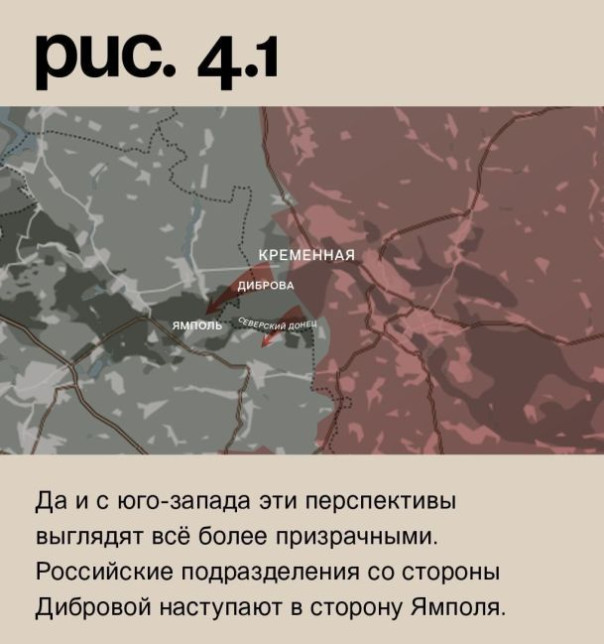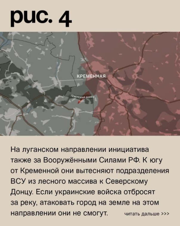 На луганском направлении инициатива также за Вооружёнными Силами РФ. К югу от Кременной они вытесняют подразделения ВСУ из лесного массива к Северскому Донцу. Если украинские войска отбросят за реку, атаковать город на земле на этом направлении они не смогут. Да и с юго-запада эти перспективы выглядят всё более призрачными. Российские подразделения со стороны Дибровой наступают в сторону Ямполя. (Рис. 4)