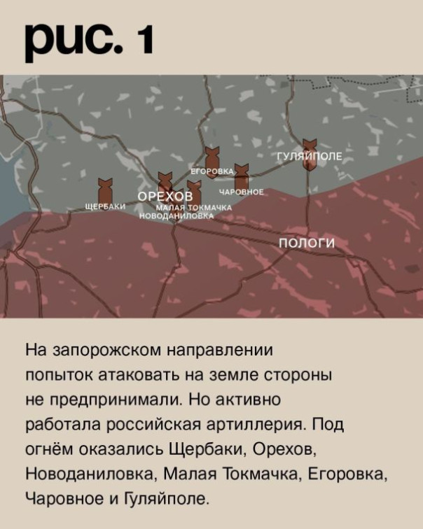 На запорожском направлении попыток атаковать на земле стороны не предпринимали. Но активно работала российская артиллерия. Под огнём оказались Щербаки, Орехов, Новоданиловка, Малая Токмачка, Егоровка, Чаровное и Гуляйполе. (Рис. 1)