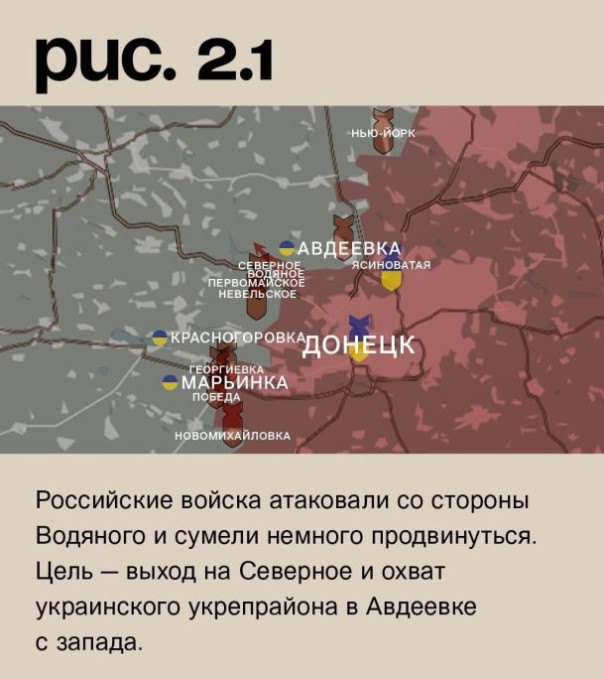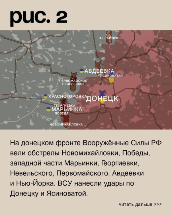 На донецком фронте Вооружённые Силы РФ вели обстрелы Новомихайловки, Победы, западной части Марьинки, Георгиевки, Невельского, Первомайского, Авдеевки и Нью-Йорка. ВСУ нанесли удары по Донецку и Ясиноватой. Российские войска атаковали со стороны Водяного и сумели немного продвинуться. Цель – выход на Северное и охват украинского укрепрайона в Авдеевке с запада. (Рис. 2)