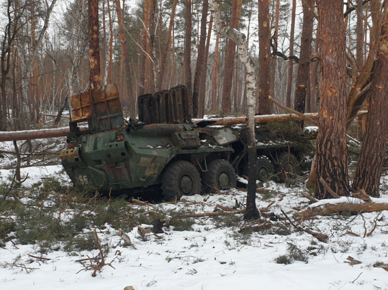 Наши военные добрались до места недавней атаки украинской армии под Кременной и собирают трофеи. На фото повреждённый огнем артиллерии БТР-80 ВСУ.