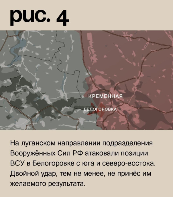 На луганском направлении подразделения Вооружённых Сил РФ атаковали позиции ВСУ в Белогоровке с юга и северо-востока. Двойной удар, тем не менее, не принёс им желаемого результата. К северо-западу российские войска продолжают наступательные действия в направлении Заречного, Ямполевки, Тернов, Невского и Макеевки. (Рис. 4)