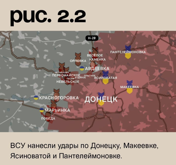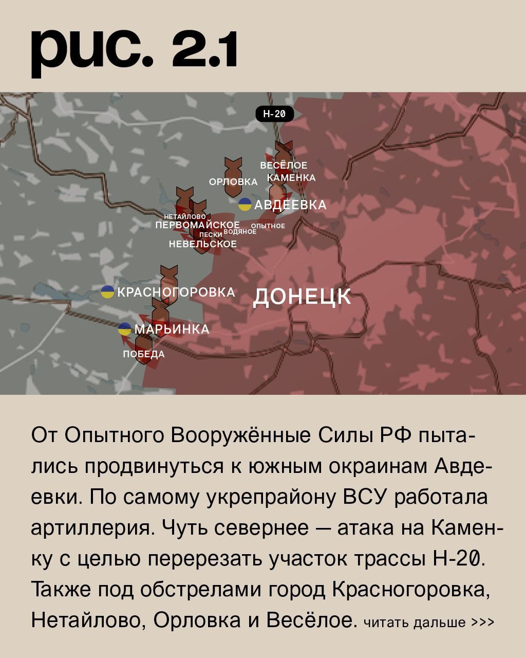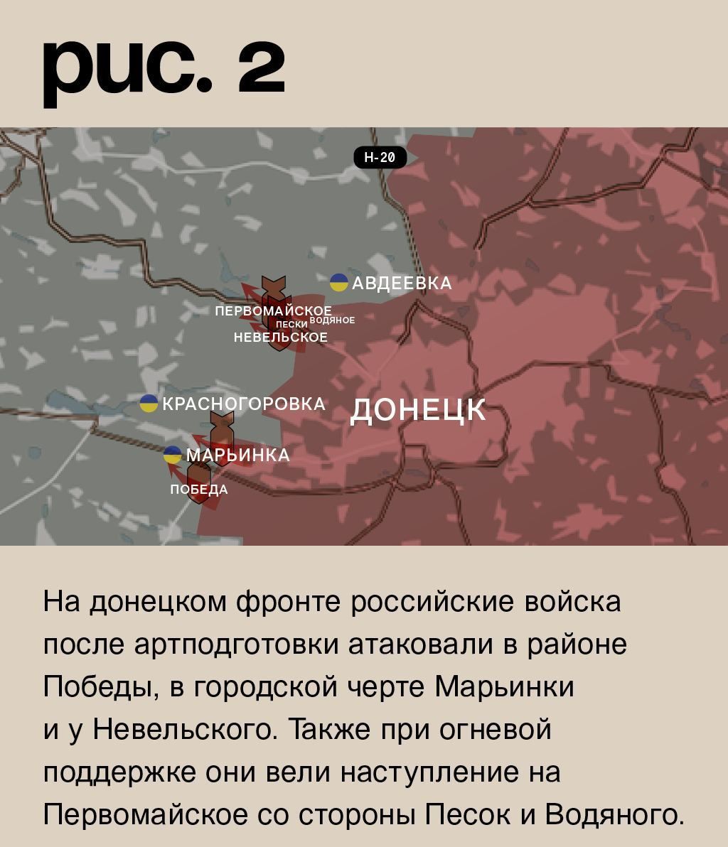 На донецком фронте ВС РФ после артподготовки атаковали в районе Победы, в городской черте Марьинки и у Невельского. Также при огневой поддержке они вели наступление на Первомайское со стороны Песок и Водяного. От Опытного Вооружённые Силы РФ пытались продвинуться к южным окраинам Авдеевки. По самому укрепрайону ВСУ работала артиллерия. Чуть севернее – атака на Каменку с целью перерезать участок трассы Н-20. Также под обстрелами город Красногоровка, Нетайлово, Орловка и Весёлое. ВСУ нанесли удары по Донецку, Макеевке, Ясиноватой и Пантелеймоновке. (Рис. 2)