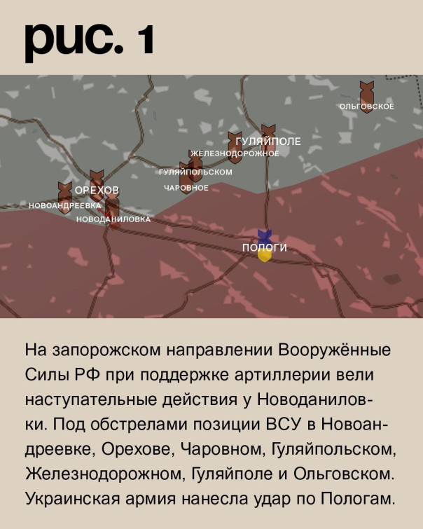 На запорожском направлении Вооружённые Силы РФ при поддержке артиллерии вели наступательные действия у Новоданиловки. Под обстрелами позиции ВСУ в Новоандреевке, Орехове, Чаровном, Гуляйпольском, Железнодорожном, Гуляйполе и Ольговском. Украинская армия нанесла удар по Пологам. (Рис. 1)