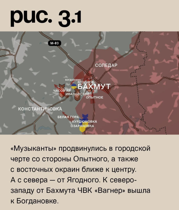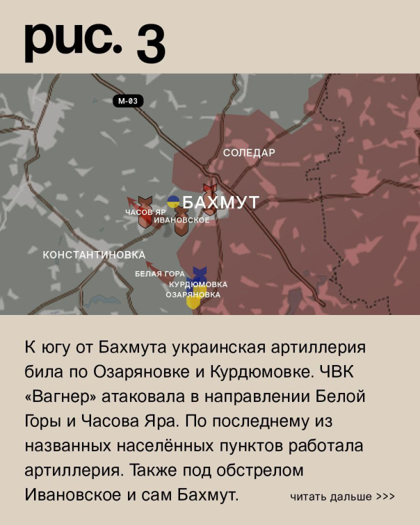 К югу от Бахмута украинская артиллерия била по Озаряновке и Курдюмовке. ЧВК «Вагнер» атаковала в направлении Белой Горы и Часова Яра. По последнему из названных населённых пунктов работала артиллерия. Также под обстрелом Ивановское и сам Бахмут. «Музыканты» продвинулись в городской черте со стороны Опытного, а также с восточных окраин ближе к центру. А с севера – от Ягодного. К северо-западу от Бахмута ЧВК «Вагнер» вышла к Богдановке. Также при поддержке артиллерии «оркестранты» атакуют в направлении Григоровки и в районе Орехово-Васильевки. Под огнём позиции ВСУ в Железнянском. К северу от Соледара ЧВК «Вагнер» ведёт наступательные действия на Фёдоровку и Роздоловку. «Музыкантов» поддерживает артиллерия. Чуть восточнее они вновь пытались прорваться к Весёлому. (Рис. 3)