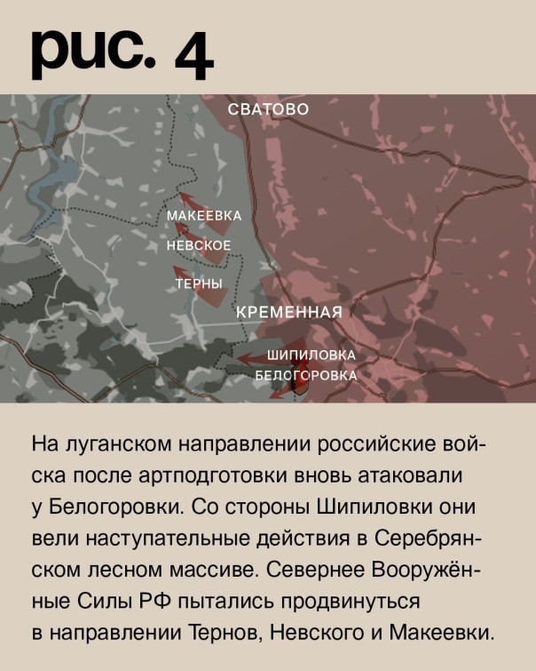 На луганском направлении российские войска после артподготовки вновь атаковали у Белогоровки. Со стороны Шипиловки они вели наступательные действия в Серебрянском лесном массиве. Севернее Вооружённые Силы РФ пытались продвинуться в направлении Тернов, Невского и Макеевки. (Рис. 4)