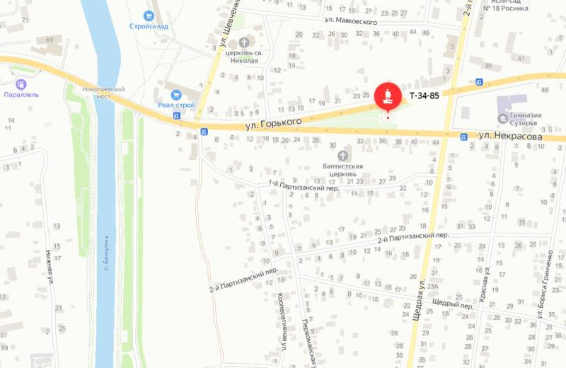 Памятник советскому танку находится в сквере на стыке улиц Горького и Некрасова примерно в 450 м от моста через Бахмутку. Мост носит название Николаевского.