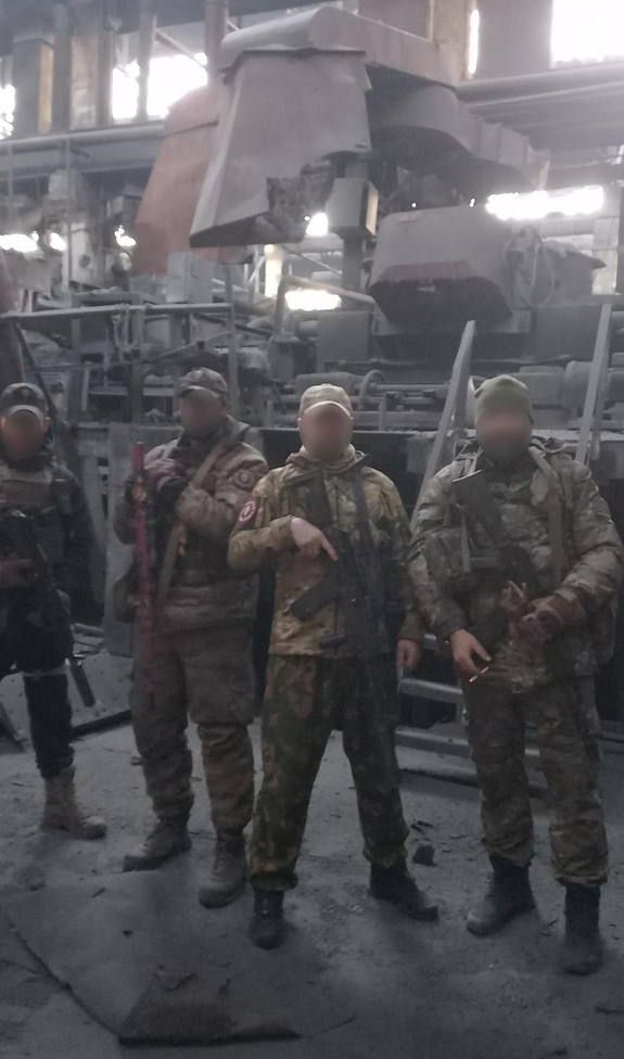 Бойцы ЧВК "Вагнер" на предприятии "Востокмаш", а конкретно — возле цеха санитарно-технической арматуры в районе завода АЗОМ в Бахмуте.
