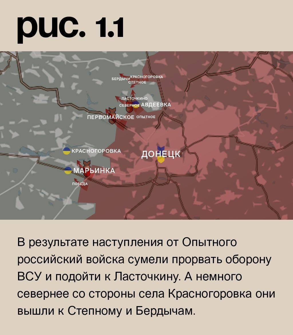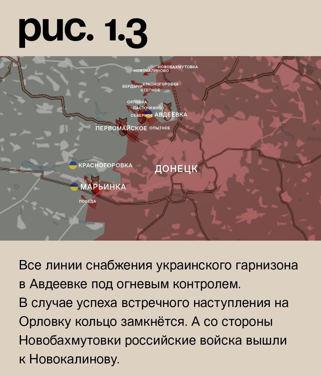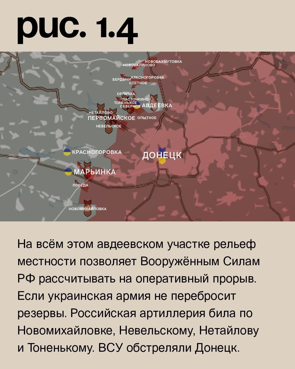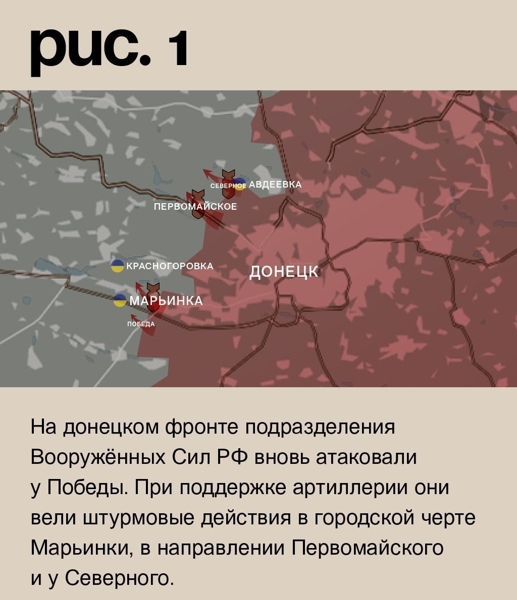 На донецком фронте подразделения Вооружённых Сил РФ вновь атаковали у Победы. При поддержке артиллерии они вели штурмовые действия в городской черте Марьинки, в направлении Первомайского и у Северного. В результате наступления от Опытного российский войска сумели прорвать оборону ВСУ и подойти к Ласточкину. А немного севернее со стороны села Красногоровка они вышли к Степному и Бердычам. Таким образом, Вооружённые Силы РФ близки к окружению укрепрайона ВСУ в Авдеевке, по которому плотно работала артиллерия и авиация. От российских позиций вблизи Ласточкина до линии соприкосновения у Степного около пяти километров. Все линии снабжения украинского гарнизона в Авдеевке под огневым контролем. В случае успеха встречного наступления на Орловку кольцо замкнётся. А со стороны Новобахмутовки российские войска вышли к Новокалинову. На всём этом авдеевском участке рельеф местности позволяет Вооружённым Силам РФ рассчитывать на оперативный прорыв. Если украинская армия не перебросит резервы. Российская артиллерия била по Новомихайловке, Невельскому, Нетайлову и Тоненькому. ВСУ обстреляли Донецк. (Рис. 1)