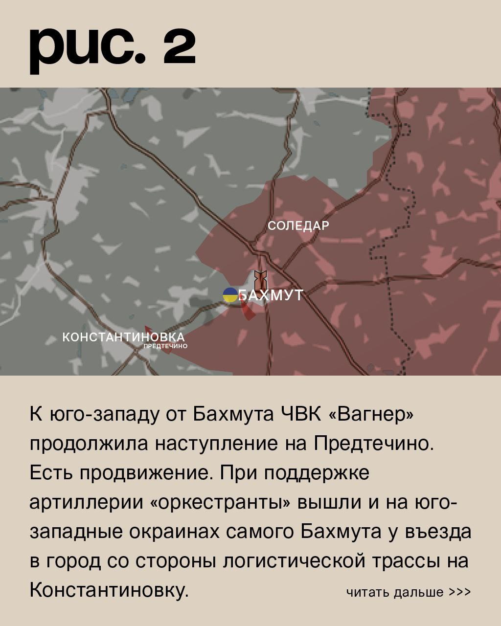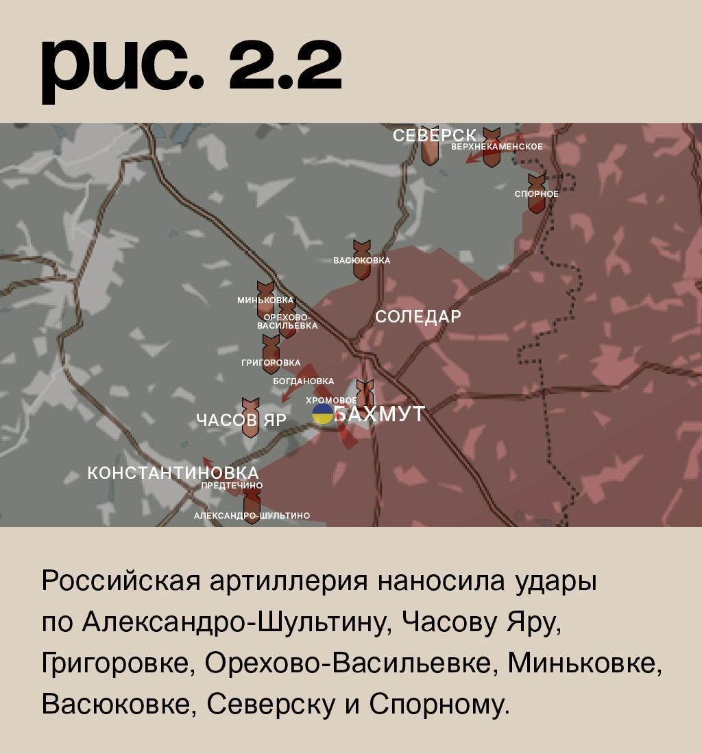 К юго-западу от Бахмута ЧВК «Вагнер» продолжила наступление на Предтечино. Есть продвижение. При поддержке артиллерии «оркестранты» вышли и на юго-западные окраинах самого Бахмута у въезда в город со стороны логистической трассы на Константиновку. «Музыканты» вели штурмовые действия у Хромового и Богдановки. Подразделения Вооружённых Сил РФ после огневого поражения продвинулись в направлении Верхнекаменского. Российская артиллерия наносила удары по Александро-Шультину, Часову Яру, Григоровке, Орехово-Васильевке, Миньковке, Васюковке, Северску и Спорному. (Рис. 2)