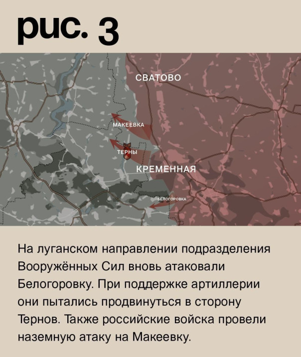 На луганском направлении подразделения Вооружённых Сил вновь атаковали Белогоровку. При поддержке артиллерии они пытались продвинуться в сторону Тернов. Также российские войска провели наземную атаку на Макеевку. (Рис. 3)