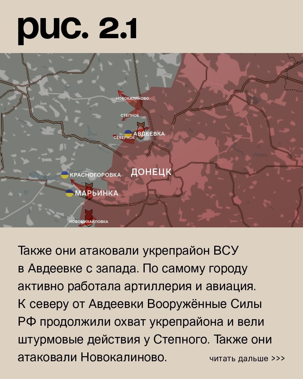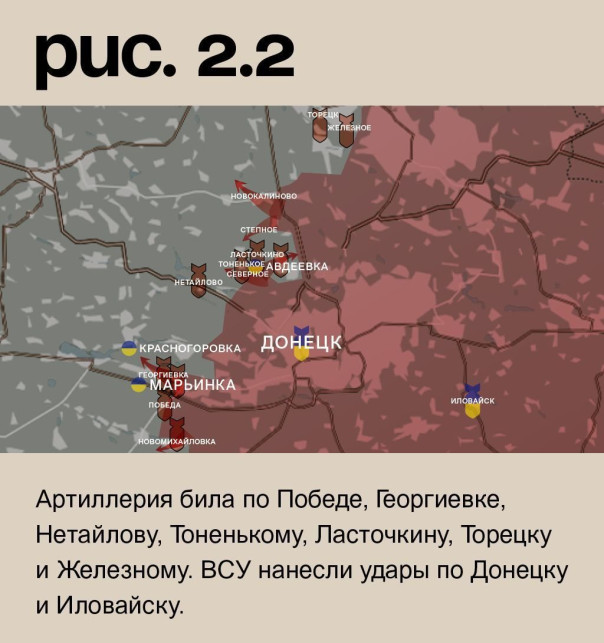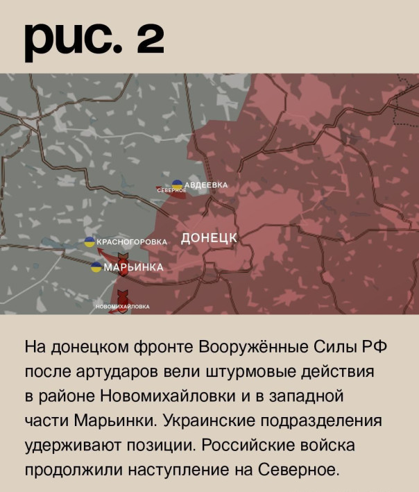 На донецком фронте Вооружённые Силы РФ после артударов вели штурмовые действия в районе Новомихайловки и в западной части Марьинки. Украинские подразделения удерживают позиции. Российские войска продолжили наступление на Северное. Также они атаковали укрепрайон ВСУ в Авдеевке с запада. По самому городу активно работала артиллерия и авиация. К северу от Авдеевки Вооружённые Силы РФ продолжили охват укрепрайона и вели штурмовые действия у Степного. Также они атаковали Новокалиново. Артиллерия била по Победе, Георгиевке, Нетайлову, Тоненькому, Ласточкину, Торецку и Железному. ВСУ нанесли удары по Донецку и Иловайску. (Рис. 2)