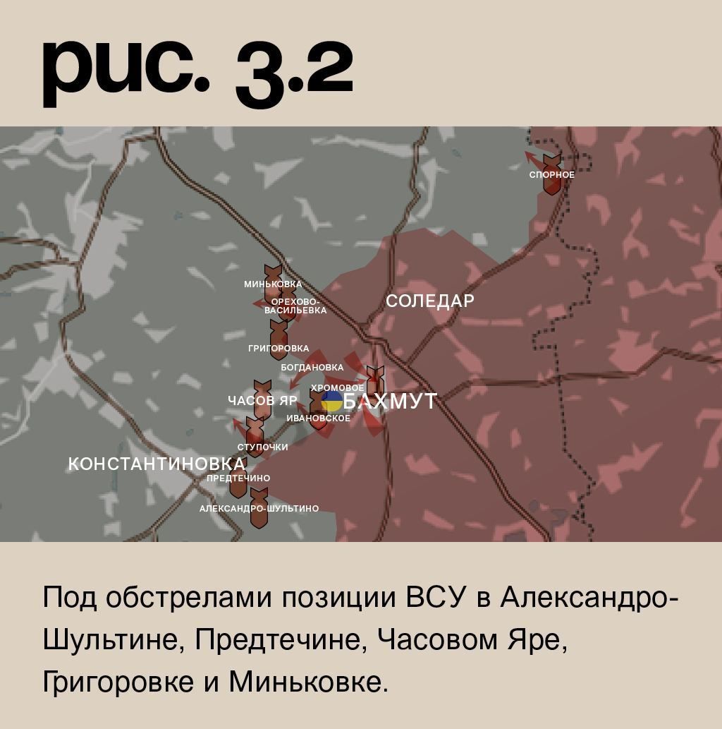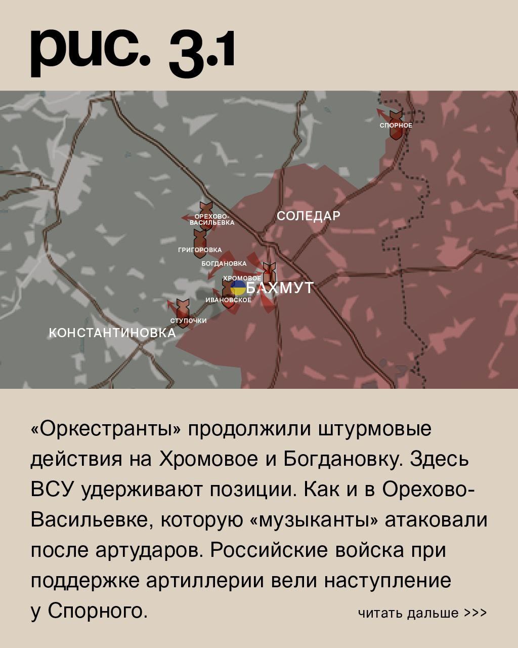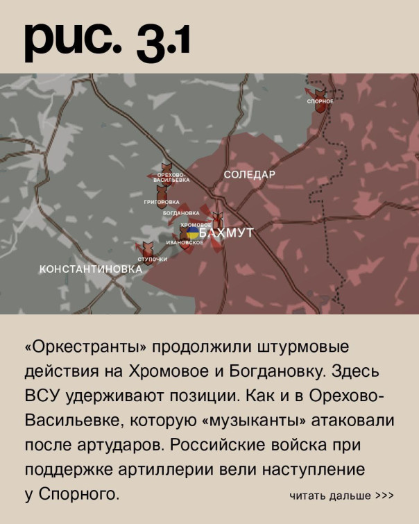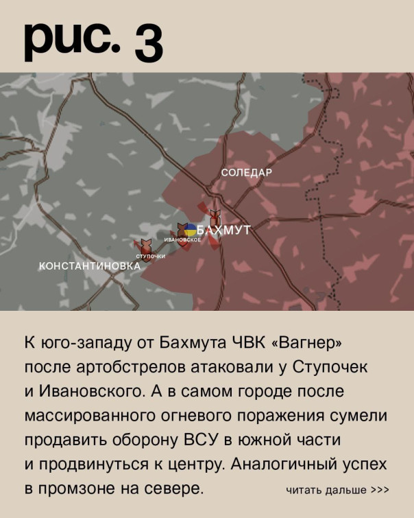 К юго-западу от Бахмута ЧВК «Вагнер» после артобстрелов атаковали у Ступочек и Ивановского. А в самом городе после массированного огневого поражения сумели продавить оборону ВСУ в южной части и продвинуться к центру. Аналогичный успех в промзоне на севере. «Оркестранты» продолжили штурмовые действия на Хромовое и Богдановку. Здесь ВСУ удерживают позиции. Как и в Орехово-Васильевке, которую «музыканты» атаковали после артударов. Российские войска при поддержке артиллерии вели наступление у Спорного. Под обстрелами позиции ВСУ в Александро-Шультине, Предтечине, Часовом Яре, Григоровке и Миньковке. (Рис. 3)