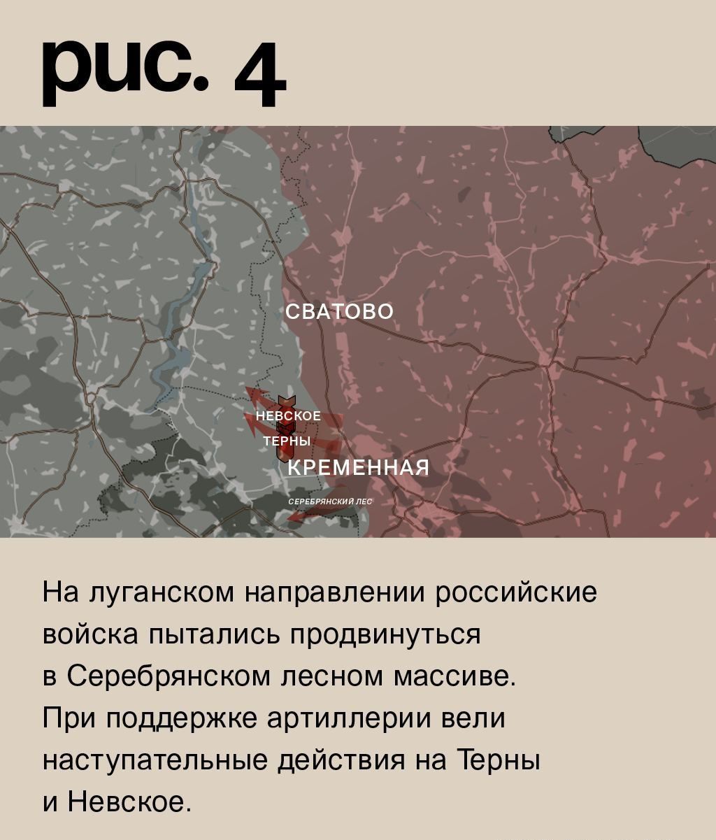 На луганском направлении российские войска пытались продвинуться в Серебрянском лесном массиве. При поддержке артиллерии вели наступательные действия на Терны и Невское. А значительно север-западнее атаковали в районе Синьковки. Цель – выдавить украинские войска за реку Оскол и продвинуться к стратегически важному Купянску. (Рис. 4)