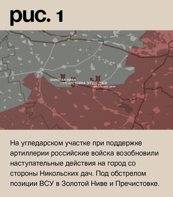 На угледарском участке при поддержке артиллерии российские войска возобновили наступательные действия на город со стороны Никольских дач. Под обстрелом позиции ВСУ в Золотой Ниве и Пречистовке. (Рис. 1)