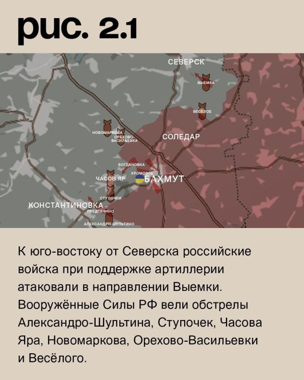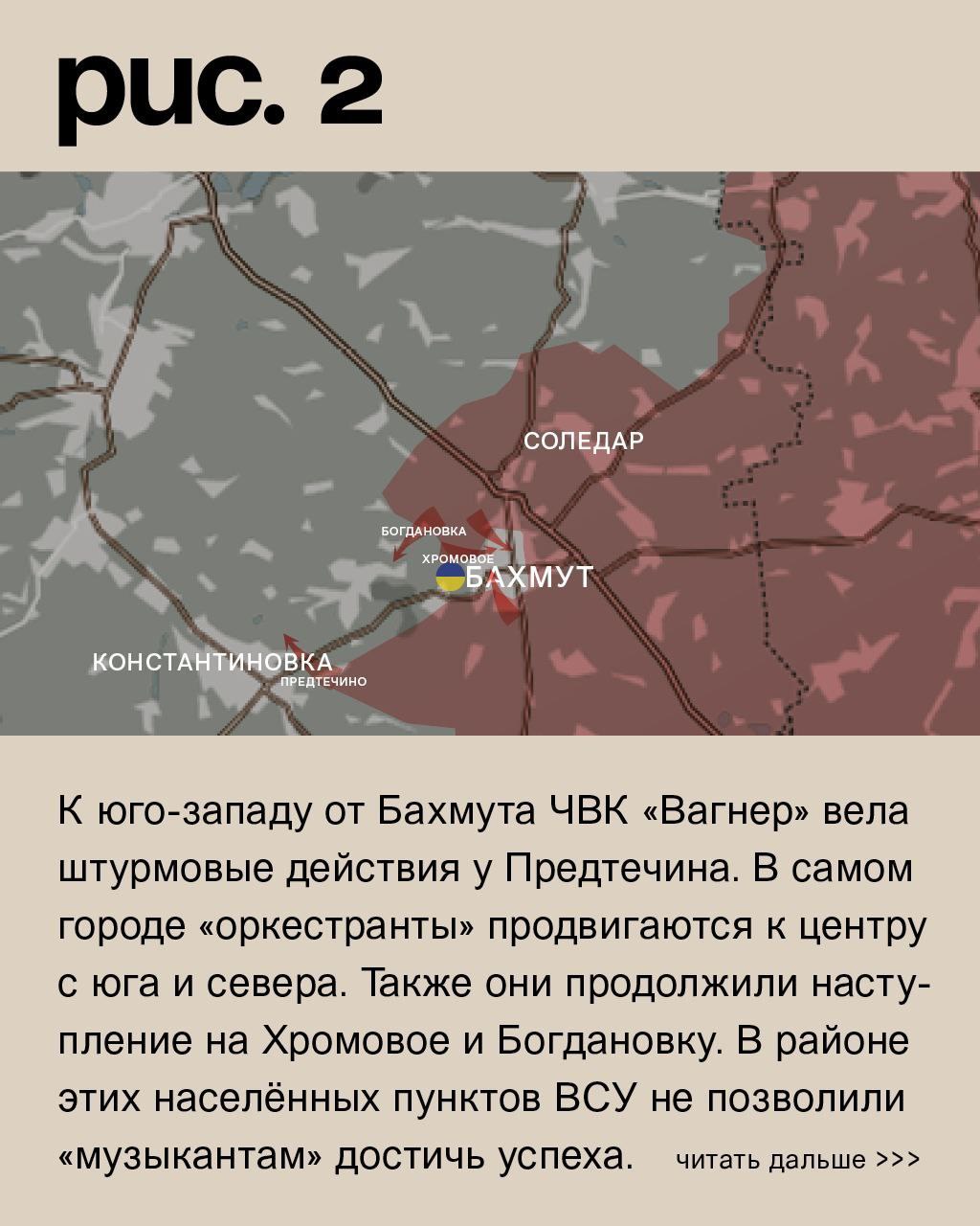 К юго-западу от Бахмута ЧВК «Вагнер» вела штурмовые действия у Предтечина. В самом городе «оркестранты» продвигаются к центру с юга и севера. Также они продолжили наступление на Хромовое и Богдановку. В районе этих населённых пунктов ВСУ не позволили «музыкантам» достичь успеха. К юго-востоку от Северска российские войска при поддержке артиллерии атаковали в направлении Выемки. Вооружённые Силы РФ вели обстрелы Александро-Шультина, Ступочек, Часова Яра, Новомаркова, Орехово-Васильевки и Весёлого. (Рис. 2)