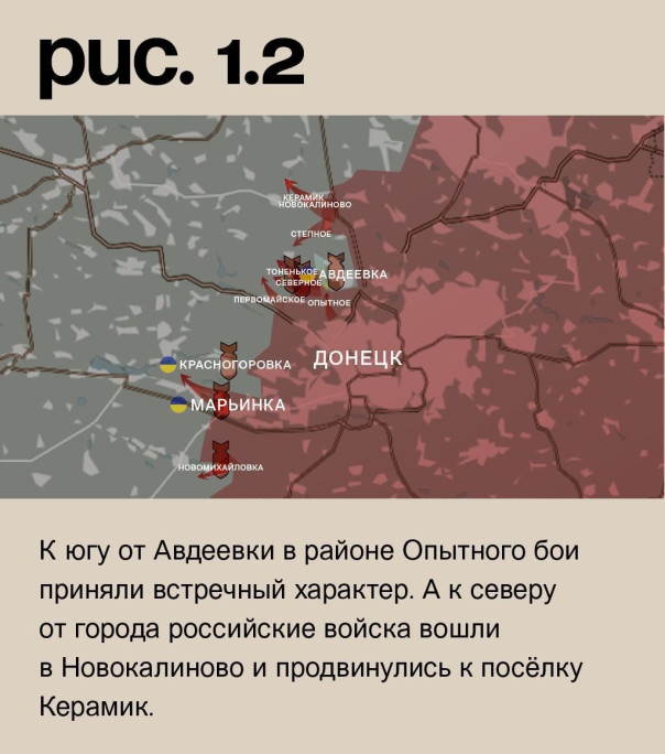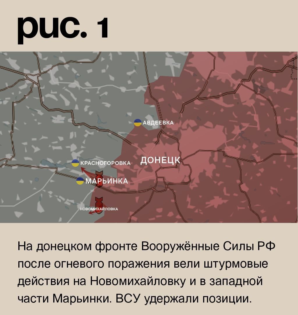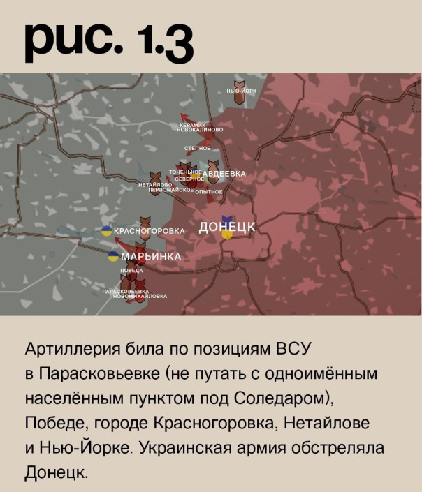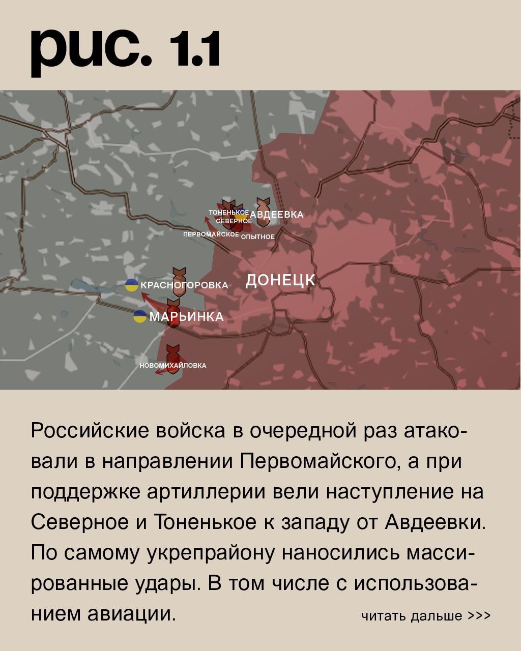 На донецком фронте Вооружённые Силы РФ после огневого поражения вели штурмовые действия на Новомихайловку и в западной части Марьинки. ВСУ удержали позиции. Российские войска в очередной раз атаковали в направлении Первомайского, а при поддержке артиллерии вели наступление на Северное и Тоненькое к западу от Авдеевки. По самому укрепрайону наносились массированные удары. В том числе с использованием авиации. К югу от Авдеевки в районе Опытного бои приняли встречный характер. А к северу от города российские войска вошли в Новокалиново и продвинулись к посёлку Керамик. Артиллерия била по позициям ВСУ в Парасковьевке (не путать с одноимённым населённым пунктом под Соледаром), Победе, городе Красногоровка, Нетайлове и Нью-Йорке. Украинская армия обстреляла Донецк. (Рис. 1)