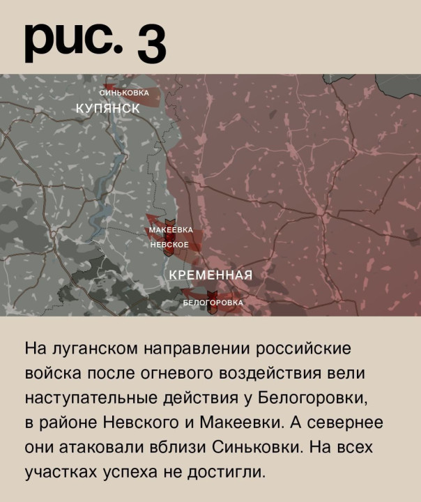 На луганском направлении российские войска после огневого воздействия вели наступательные действия у Белогоровки, в районе Невского и Макеевки. А севернее они атаковали вблизи Синьковки. На всех участках успеха не достигли. (Рис. 3)