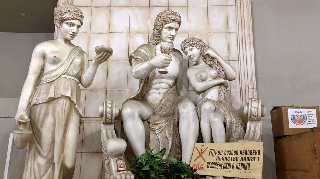 Внутри, в коридорах, всё напоминает о недавнем прошлом. Стеллажи с розовым, красным и белым игристым. Доска почета. Картины с девчатами, собирающими виноград. Скульптура Диониса.