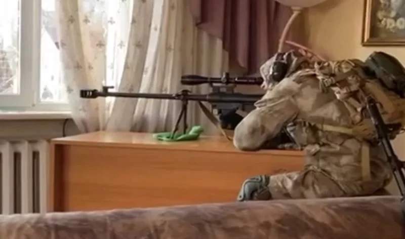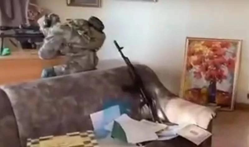 Снайпер ВСУ, оборудовавший свою позицию в одной из квартир с мебелью, попал в кадр