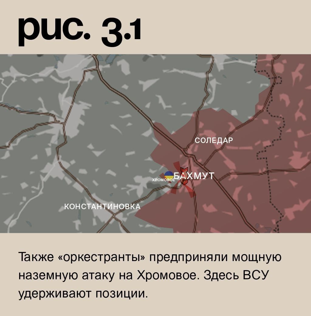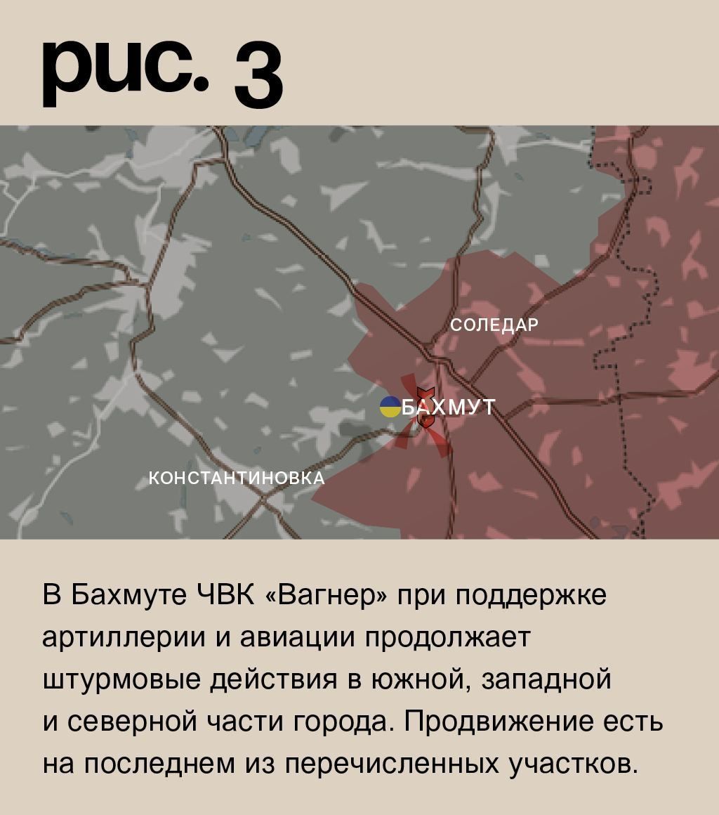 В Бахмуте ЧВК «Вагнер» при поддержке артиллерии и авиации продолжает штурмовые действия в южной, западной и северной части города. Продвижение есть на последнем из перечисленных участков. Также «оркестранты» предприняли мощную наземную атаку на Хромовое. Здесь ВСУ удерживают позиции. Российская артиллерия била по Белой Горе, Александро-Шультину, Константиновке, Предтечину, Ступочкам, Ивановскому, Часову Яру, Григоровке, Новомаркову, Орехово-Васильевке, Миньковке, Васюковке, Фёдоровке, Спорному и Верхнекаменскому. (Рис. 3)