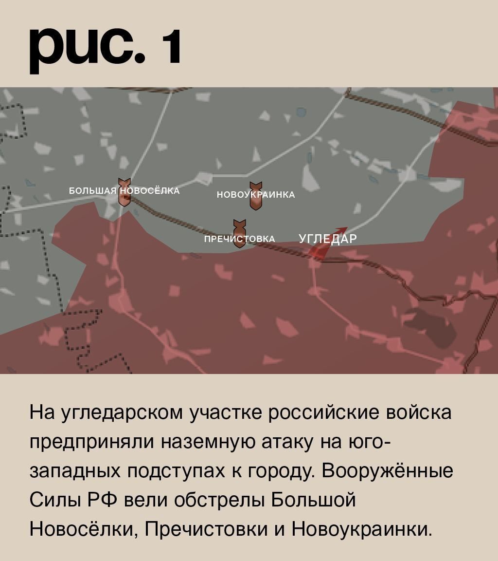 На угледарском участке российские войска предприняли наземную атаку на юго-западных подступах к городу. Вооружённые Силы РФ вели обстрелы Большой Новосёлки, Пречистовки и Новоукраинки. (Рис. 1)