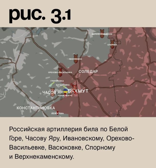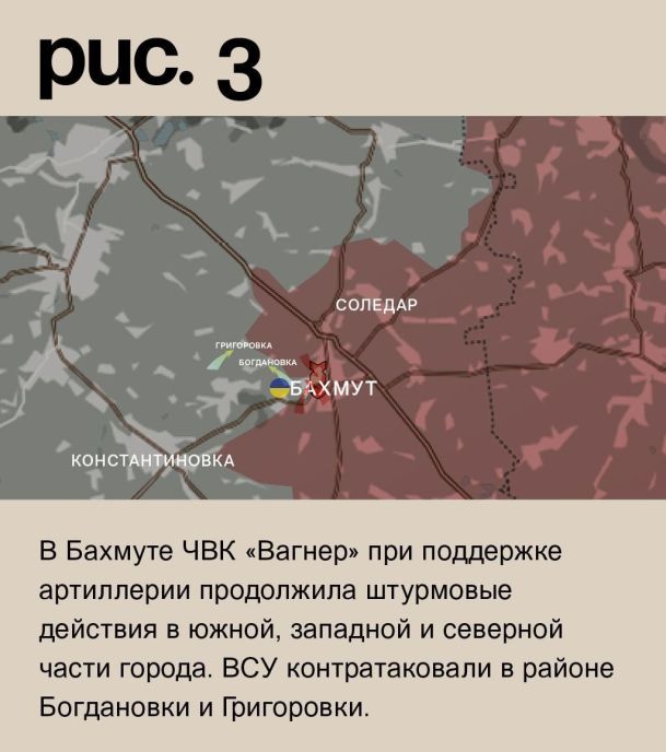 В Бахмуте ЧВК «Вагнер» при поддержке артиллерии продолжила штурмовые действия в южной, западной и северной части города. ВСУ контратаковали в районе Богдановки и Григоровки. Российская артиллерия била по Белой Горе, Часову Яру, Ивановскому, Орехово-Васильевке, Васюковке, Спорному и Верхнекаменскому. (Рис. 3)