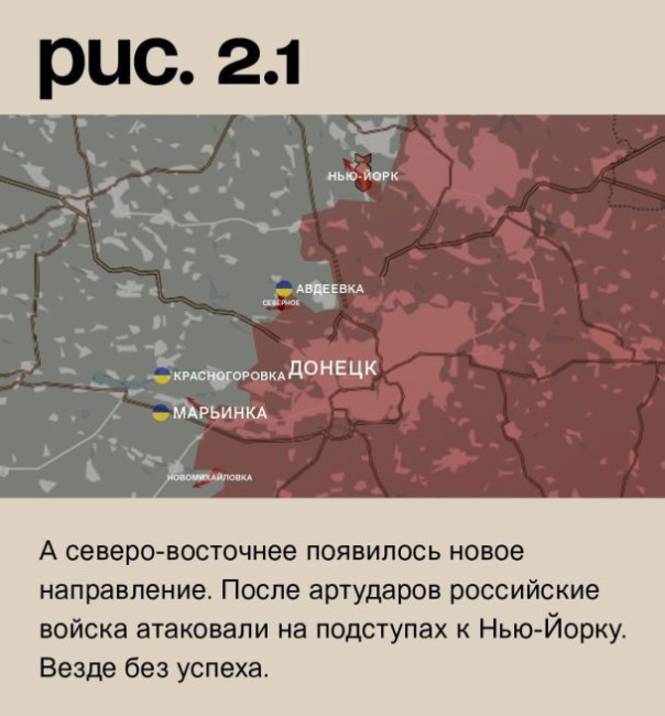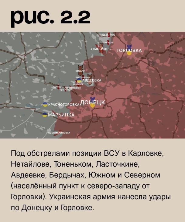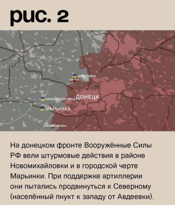 На донецком фронте Вооружённые Силы РФ вели штурмовые действия в районе Новомихайловки и в городской черте Марьинки. При поддержке артиллерии они пытались продвинуться к Северному (населённый пнукт к западу от Авдеевки). А северо-восточнее появилось новое направление. После артударов российские войска атаковали на подступах к Нью-Йорку. Везде без успеха. Под обстрелами позиции ВСУ в Карловке, Нетайлове, Тоненьком, Ласточкине, Авдеевке, Бердычах, Южном и Северном (населённый пункт к северо-западу от Горловки). Украинская армия нанесла удары по Донецку и Горловке. (Рис. 2)