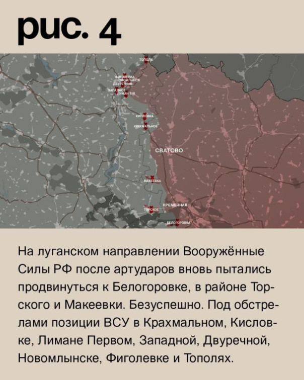 На луганском направлении Вооружённые Силы РФ после артударов вновь пытались продвинуться к Белогоровке, в районе Торского и Макеевки. Безуспешно. Под обстрелами позиции ВСУ в Крахмальном, Кисловке, Лимане Первом, Западной, Двуречной, Новомлынске, Фиголевке и Тополях. (Рис. 4)