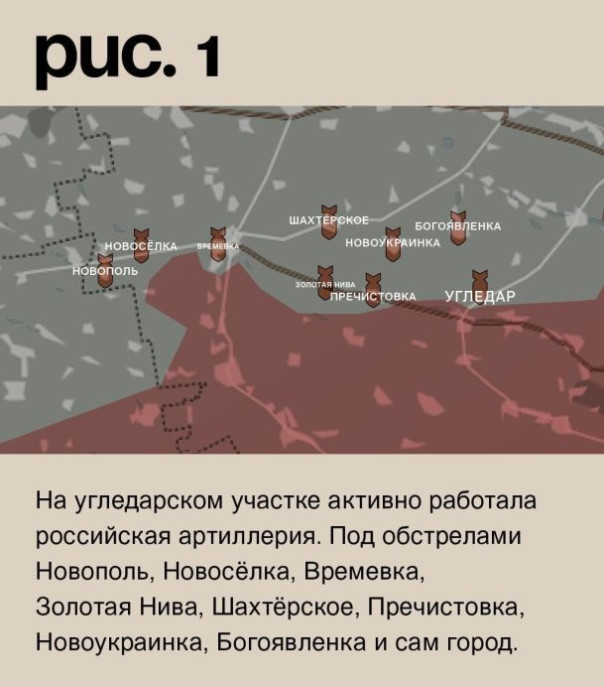 На угледарском участке активно работала российская артиллерия. Под обстрелами Новополь, Новосёлка, Времевка, Золотая Нива, Шахтёрское, Пречистовка, Новоукраинка, Богоявленка и сам город. (Рис. 1)