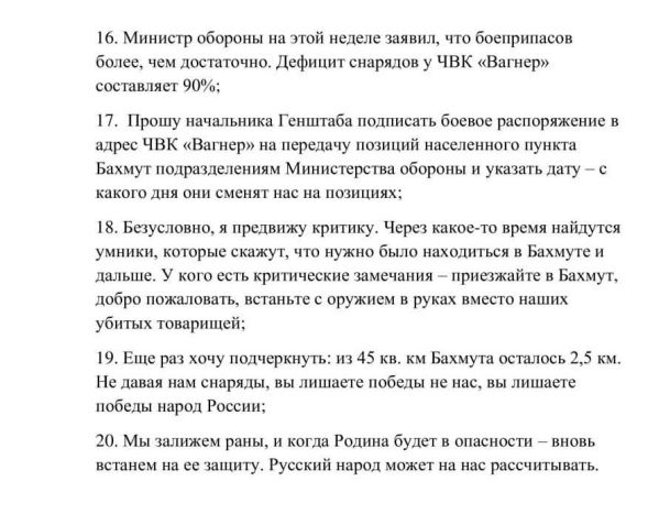 Пригожин также подчеркнул что неоднократно докладывал о проблемах с боеприпасами и просил военное ведомство о поставках с марта 2023 года, но проблема так и не была решена. К 9 мая ЧВК «Вагнер» должны были полностью овладеть Артёмовском по намеченному плану.