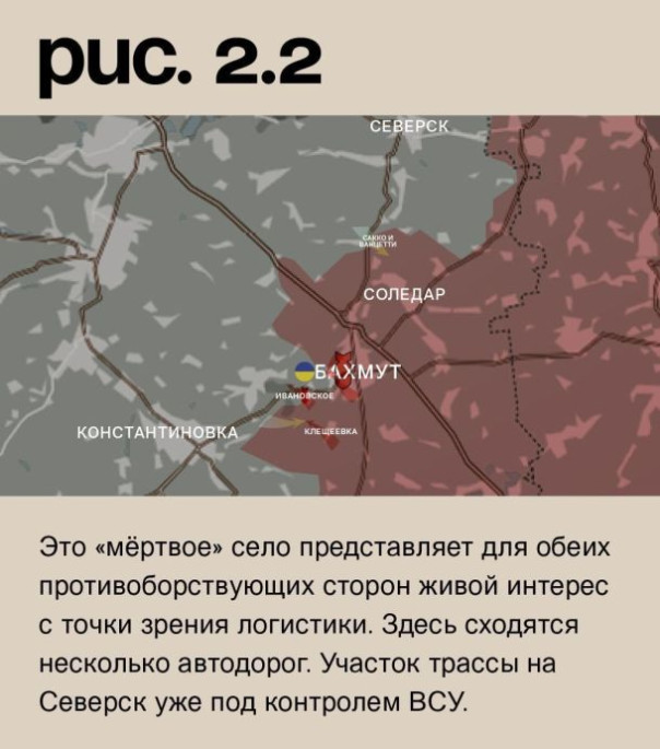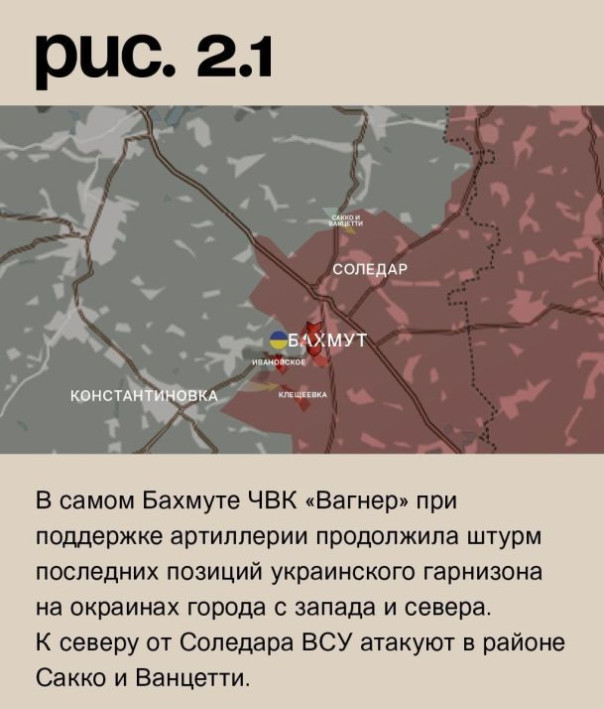 К югу от Бахмута – ожесточённые встречные бои на западных подступах к Клещеевке. Российские войска после артударов пытались контратаковать в направлении Ивановского. Без успеха. В самом Бахмуте ЧВК «Вагнер» при поддержке артиллерии продолжила штурм последних позиций украинского гарнизона на окраинах города с запада и севера. К северу от Соледара ВСУ атакуют в районе Сакко и Ванцетти. Это «мёртвое» село представляет для обеих противоборствующих сторон живой интерес с точки зрения логистики. Российские войска обстреливали Белую Гору, Предтечино, Часов Яр, Богдановку, Григоровку, Новомарково, Орехово-Васильевку, Васюковку, Весёлое, Спорное и Верхнекаменское. Украинская армия била по Курдюмовке, подконтрольным ЧВК «Вагнер» районам Бахмута и Железнянскому. (Рис. 2)