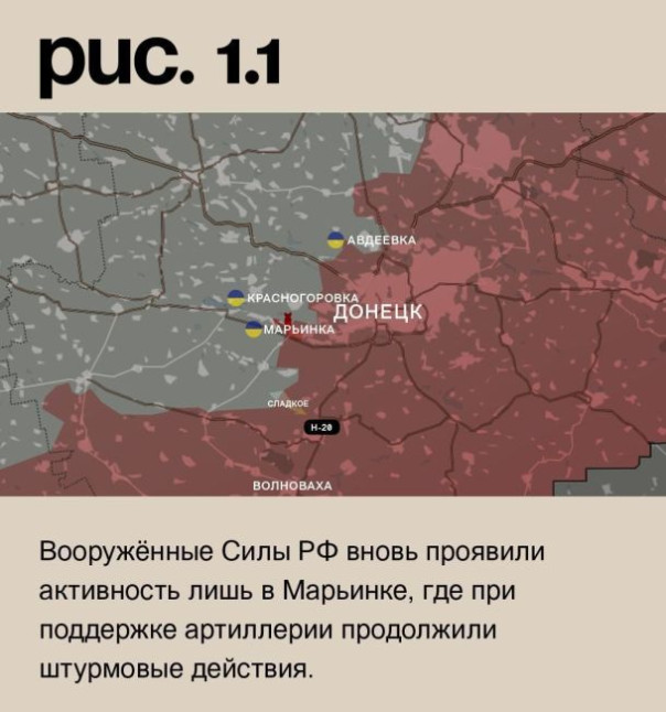 На донецком фронте ВСУ вели наступательные действия в направлении Сладкого. Больше года в этой зоне активных боевых действий не было. Таким образом, украинские войска стремятся выйти к участку трассы Н-20, который идёт на Волноваху. ВС РФ вновь проявили активность в Марьинке, где при поддержке артиллерии продолжили штурмовые действия. Под обстрелами позиции ВСУ в Новомихайловке, Парасковьевке, городе Красногоровка, Невельском, Первомайском, Карловке, Авдеевке, Новосёловке Первой, Новокалинове, Шумах и Северном (населённый пункт к северо-западу от Горловки). ВСУ нанесли удары по Донецку, Ясиноватой и Горловке. (Рис. 1)