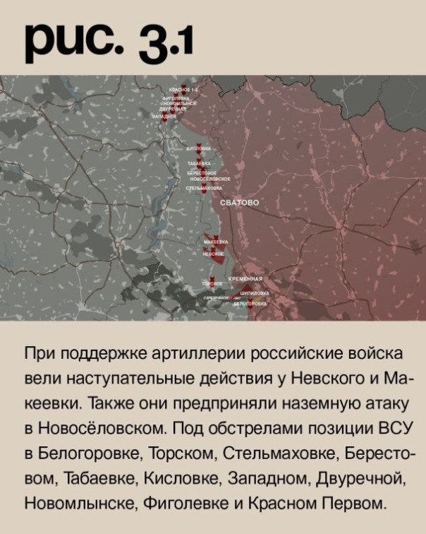 На луганском направлении ВСУ контратаковали вблизи Белогоровки и заняли ряд ранее утраченных позиций. ВС РФ, в свою очередь, сумели продвинуться в Серебрянском лесном массиве в районе Шипиловки. При поддержке артиллерии российские войска вели наступательные действия у Невского и Макеевки. Также они предприняли наземную атаку в Новосёловском. Под обстрелами позиции ВСУ в Белогоровке, Торском, Стельмаховке, Берестовом, Табаевке, Кисловке, Западном, Двуречной, Новомлынске, Фиголевке и Красном Первом. (Рис. 3)