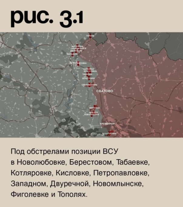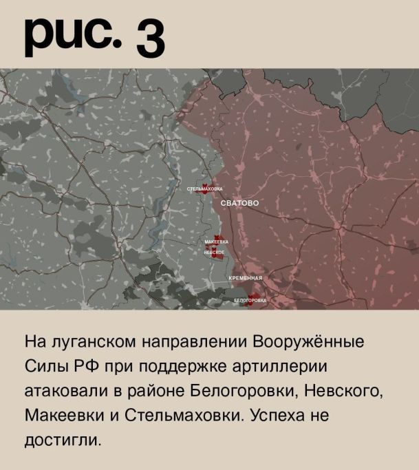 На луганском направлении Вооружённые Силы РФ при поддержке артиллерии атаковали в районе Белогоровки, Невского, Макеевки и Стельмаховки. Успеха не достигли. Под обстрелами позиции ВСУ в Новолюбовке, Берестовом, Табаевке, Котляровке, Кисловке, Петропавловке, Западном, Двуречной, Новомлынске, Фиголевке и Тополях. (Рис. 3)