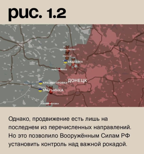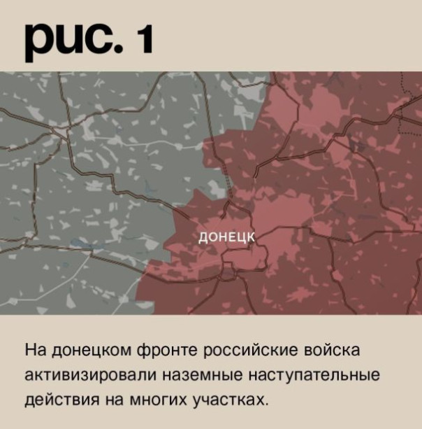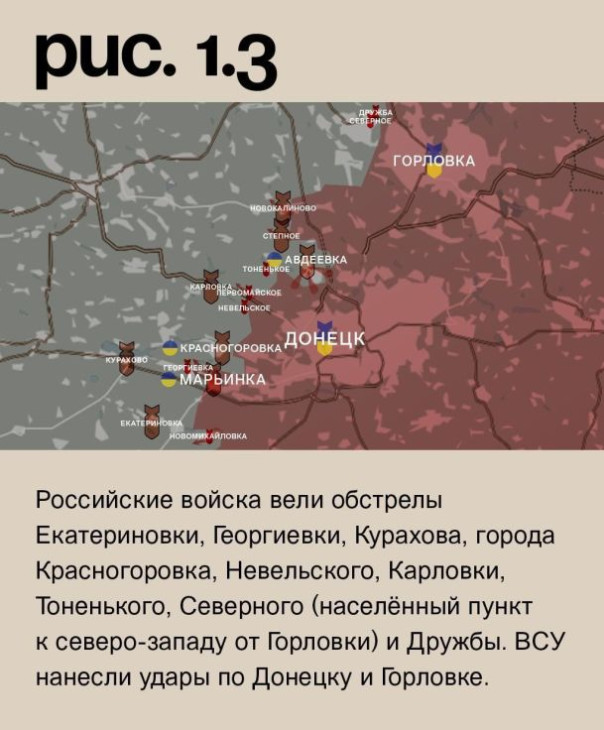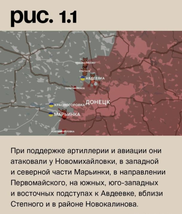 На донецком фронте российские войска активизировали наземные наступательные действия на многих участках. При поддержке артиллерии и авиации они атаковали у Новомихайловки, в западной и северной части Марьинки, в направлении Первомайского, на южных, юго-западных и восточных подступах к Авдеевке, вблизи Степного и в районе Новокалинова. Однако, продвижение есть лишь на последнем из перечисленных направлений. Но это позволило Вооружённым Силам РФ установить контроль над важной рокадой. Российские войска вели обстрелы Екатериновки, Георгиевки, Курахова, города Красногоровка, Невельского, Карловки, Тоненького, Северного (населённый пункт к северо-западу от Горловки) и Дружбы. ВСУ нанесли удары по Донецку и Горловке. (Рис. 1)