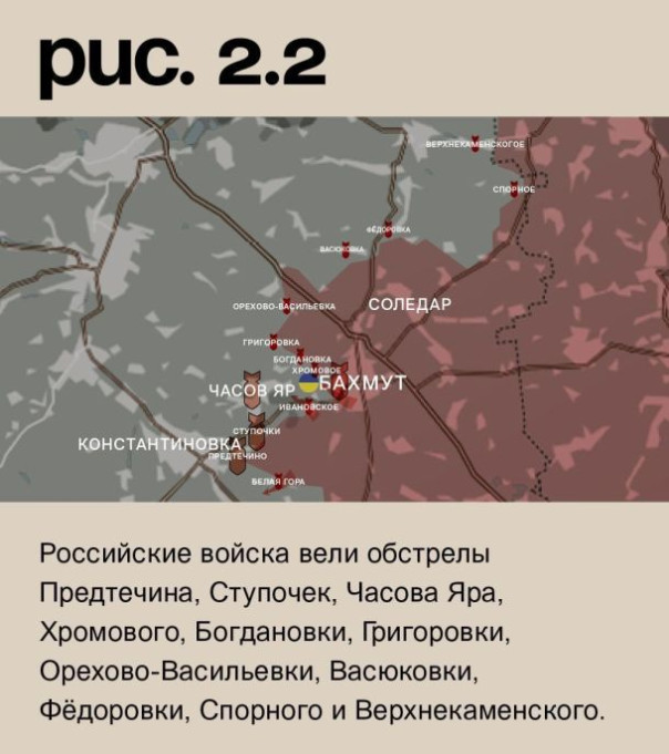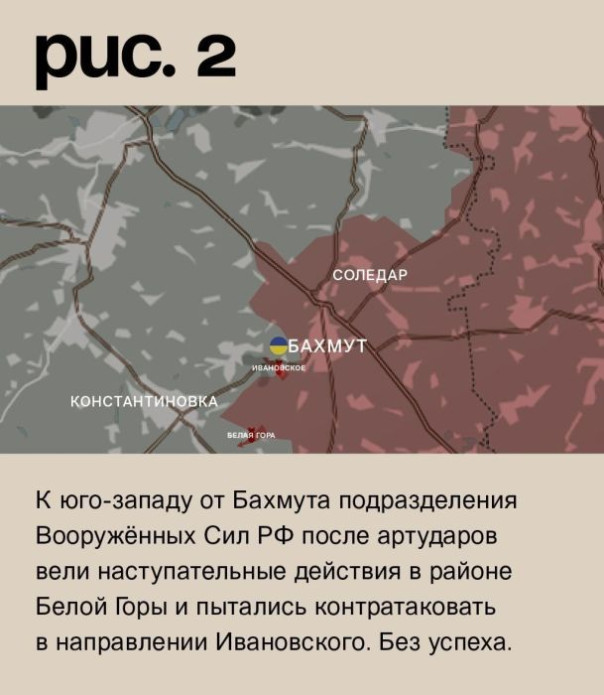 К юго-западу от Бахмута подразделения Вооружённых Сил РФ после артударов вели наступательные действия в районе Белой Горы и пытались контратаковать в направлении Ивановского. Без успеха. В самом городе при поддержке артиллерии ЧВК «Вагнер» вела штурмовые действия в последнем подконтрольном ВСУ квартале на юго-западной окраине. «Оркестранты» заявили об установлении полного контроля над Бахмутом. Российские войска вели обстрелы Предтечина, Ступочек, Часова Яра, Хромового, Богдановки, Григоровки, Орехово-Васильевки, Васюковки, Фёдоровки, Спорного и Верхнекаменского. (Рис. 2)