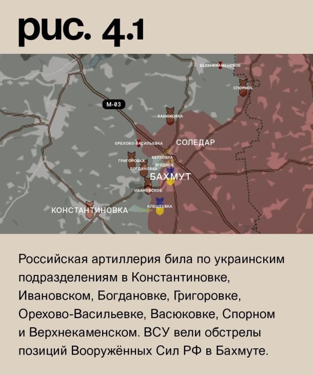 На бахмутском направлении после артударов ВСУ сумели продвинуться в районе Клещеевки. Также они вели штурмовые действия у Ягодного и Берховки. Здесь без успеха. Российская артиллерия била по украинским подразделениям в Константиновке, Ивановском, Богдановке, Григоровке, Орехово-Васильевке, Васюковке, Спорном и Верхнекаменском. ВСУ вели обстрелы позиций Вооружённых Сил РФ в Бахмуте. (Рис. 4)