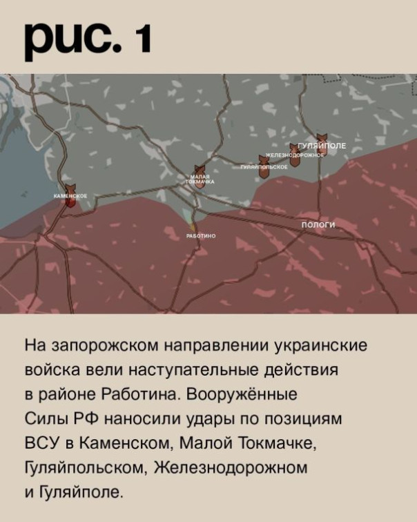 На запорожском направлении украинские войска вели наступательные действия в районе Работина. Вооружённые Силы РФ наносили удары по позициям ВСУ в Каменском, Малой Токмачке, Гуляйпольском, Железнодорожном и Гуляйполе. (Рис. 1)